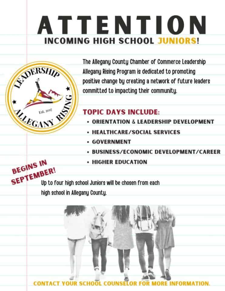 The Leadership Allegany Rising program, modeled after the Chamber’s very successful Leadership Allegany program, is dedicated to providing positive change by creating a network of future leaders committed to impacting their community. The participants, all high school juniors, are from Allegany High School, Bishop Walsh School, Calvary Christian Academy, the Center for Career and Technical Education, Fort Hill High School, and Mountain Ridge High School.